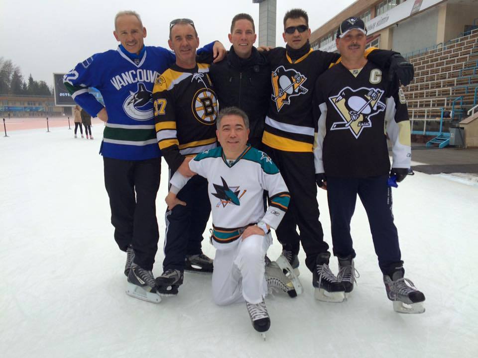 Michael Ryan (plain top) with new friends at Medeo’s huge skating rink